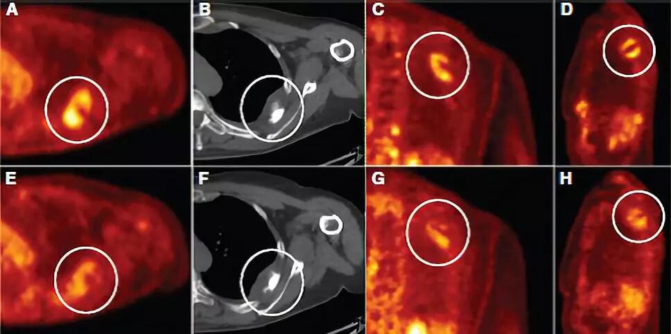 图3恶性胸膜神经鞘瘤患者接受帕唑帕尼治疗呈现持久的临床获益,A-D与E-H为图像对比