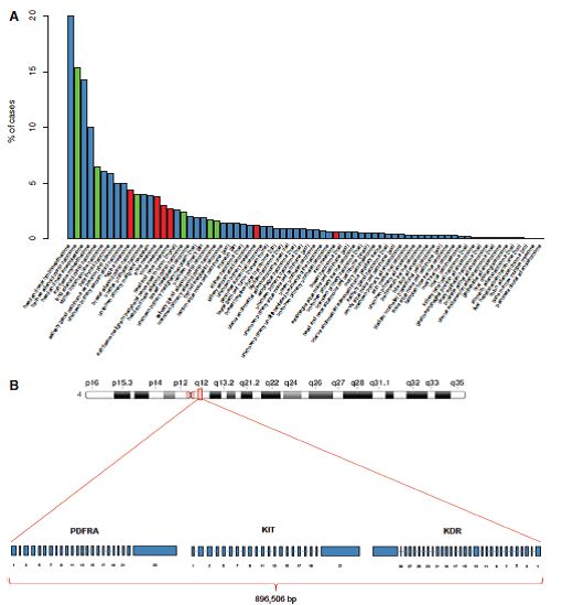 图1 进展期肿瘤4q12 amp发生频度。(A)除了肺癌、原发脑肿瘤和肉瘤,所有肿瘤中4q12 amp的发生频度,AdCC为绿色,黑色素瘤为红色;(B)4q12模式图