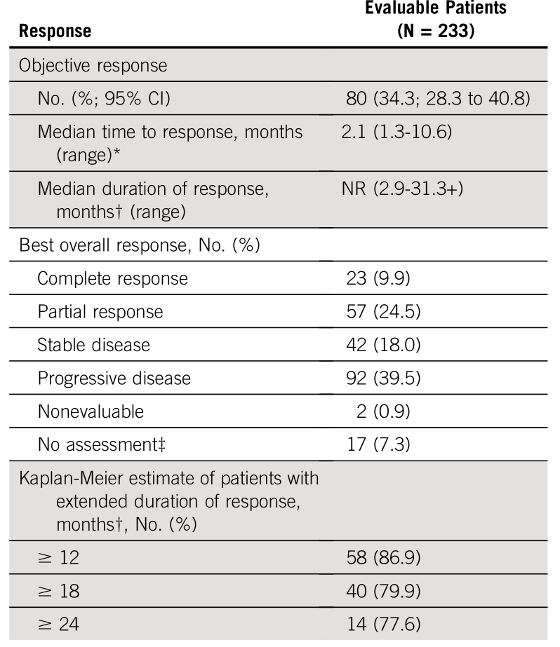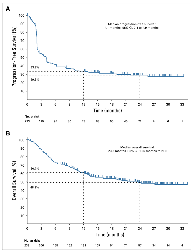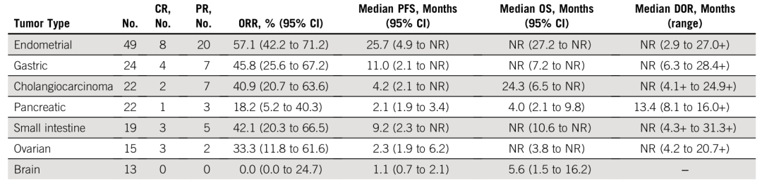 233例患者,总共包含27种肿瘤类型,子宫内膜癌、胃癌、胆管癌和胰腺癌最常见。中位随访13.4个月,客观治疗反应率34.3%(95%CI,28.3%~40.8%)(表1),中位无进展生存4.1个月(95%CI,2.4~4.9个月),中位总生存23.5个月(95%CI,13.5个月~未达到)(图2)。治疗相关不良事件151例(64.8%),34例(14.6%)患者发生3~5级治疗相关不良事件,1例5级肺炎,无其他治疗相关的致命性不良事件。