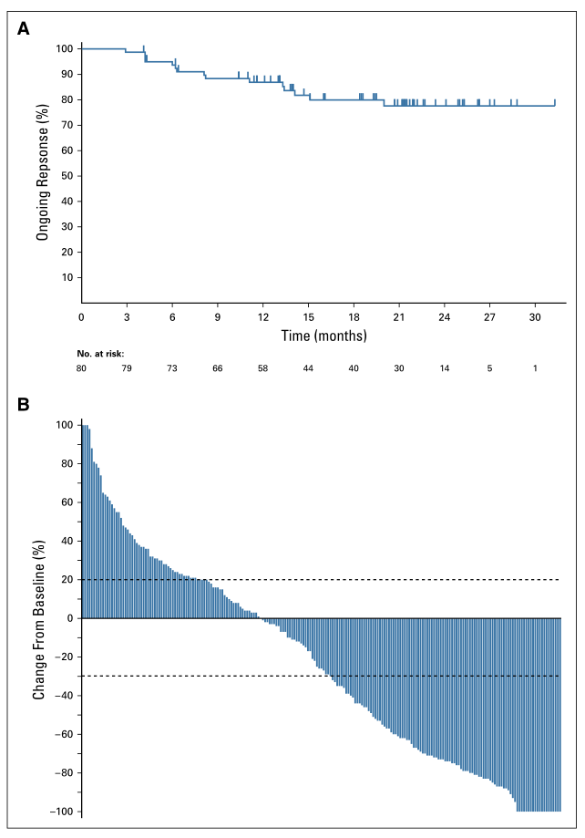 图1 (A)治疗反应持续时间;(B)肿瘤较基线最佳变化