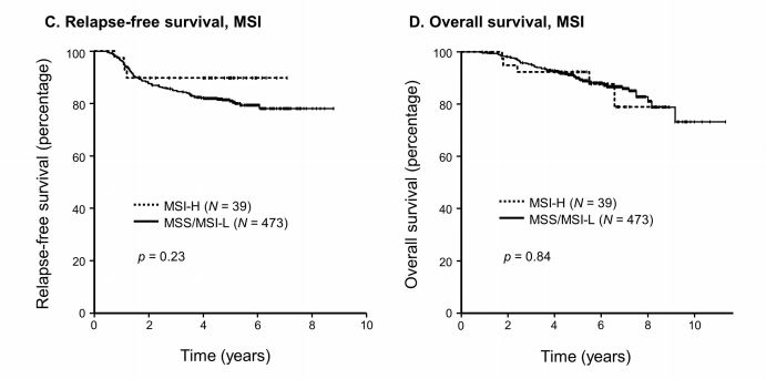 通过评估5个微卫星标记(D2S123,D5S346,D17S250,BAT25, BAT26)来确定每个肿瘤的微卫星状态。将MSI状态分类如下:MSI-H(≥2个微卫星标记不稳定)、MSI-L(1个标记不稳定)或MSS(微卫星稳定)。