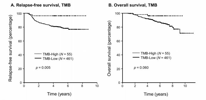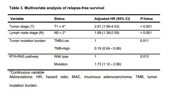 TMB高CRC肿瘤患者群体较TMB低群体OS有延长趋势(5年OS:96.2% vs 89.6%;p=0.060)。但TMB并非这部分患者OS的独立预后因素。