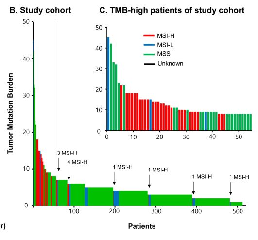 图1. 左图:每例患者的40基因突变负荷;右图:高TMB患者的MSI状态