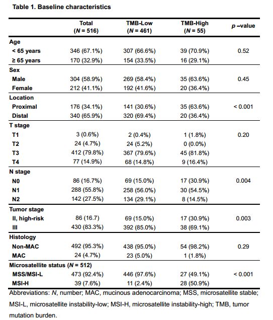 本研究中,高TMB肿瘤定义为≥8个突变,≤7个突变则为低TMB。516名患者中,55名(10.7%)患者为TMB高肿瘤。高TMB肿瘤多发生于近端,N0(II期)发生率较高,多为MSI-H。但28.9%的MSI-H被归为低TMB肿瘤。MSI-H患者中粘液腺癌(MAC)发病率为12.8%,根据TMB状态有所不同。仅1例高TMB患者为粘液腺癌。高/低TMB患者的年龄、性别、T分期均无明显差异。
