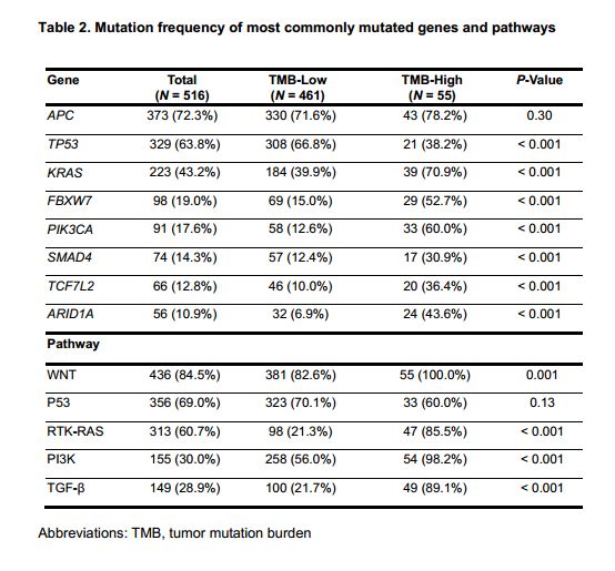 根据TCGA数据的结果,高TMB肿瘤中TP53突变频率较低。尽管高TMB肿瘤中更易发生基因突变,但TMB高/低肿瘤中APC基因突变频率并无显著差异(78.2% vs 71.6%,P=0.30)。除P53通路之外(由于TP53突变率较低),其他通路突变在TMB高CRC肿瘤中发生更为频繁。