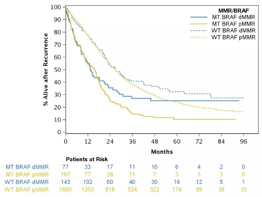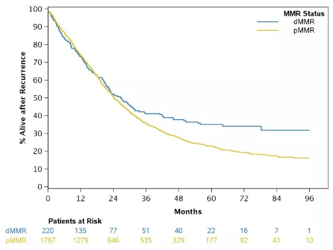 与既往研究不同的是,这项研究中患者均为复发且接受了与辅助治疗相同的治疗,这也许可以解释为什么这项研究结果与无法切除mCRC一线治疗患者的研究结果不同。然而CALGB/SWOG 80405研究则显示,dMMR状态并不是不良预后因素。