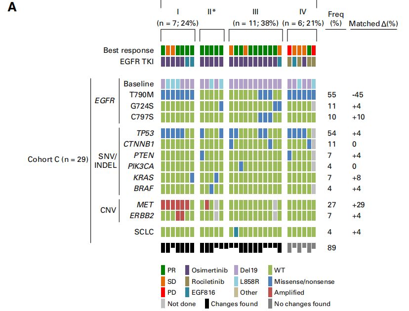 图3(A)第三代EGFR TKI治疗后队列C患者的测序(单核苷酸变异[SNV]和插入/缺失[indels])和拷贝数变异(CNV)分析图谱。,患者分为4组:(I)变异发生于非EGFR基因,(II)变异发生于EGFR且同时存在EGFR之外的变异,(III)变异仅发生于EGFR,(IV)未发现变异;(B)中位PFS:I组9.6个月、I组7.3个月、III组8.2个月、IV组4.8个月,无显著差异;(C)从三代抑制剂出现进展到患者死亡的中位生存期: I组5个月、II组8个月、III组3.3个月、IV组1.7个月,无显著差异
