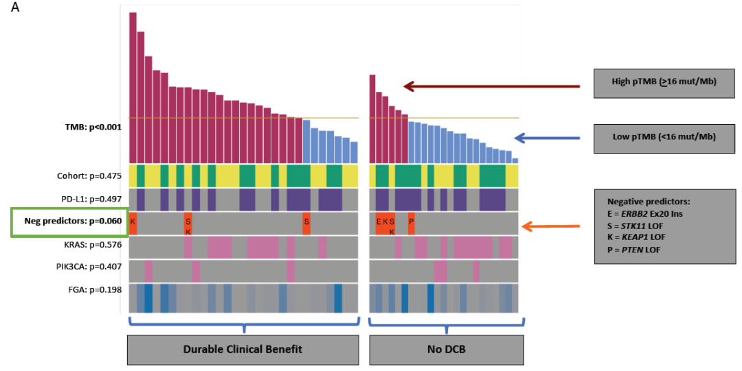 尽管肿瘤组织TMB作为免疫治疗疗效预测的生物标志物的研究颇多,但一直以来争议不断,本研究证实pTMB不但具有无创的优点,而且能全面反应肿瘤异质性,与免疫治疗负性基因联合检测能够较准确的预测免疫治疗的疗效,提示接受免疫治疗单药或联合化疗的非小细胞肺癌患者尽量接受NGS大Panel检测,以更好地对疗效及预后进行有效预测及指导。