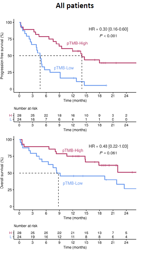 图2 52例患者的PFS和OS的Kaplan-Meier 生存曲线,pTMB界值16mut/Mb