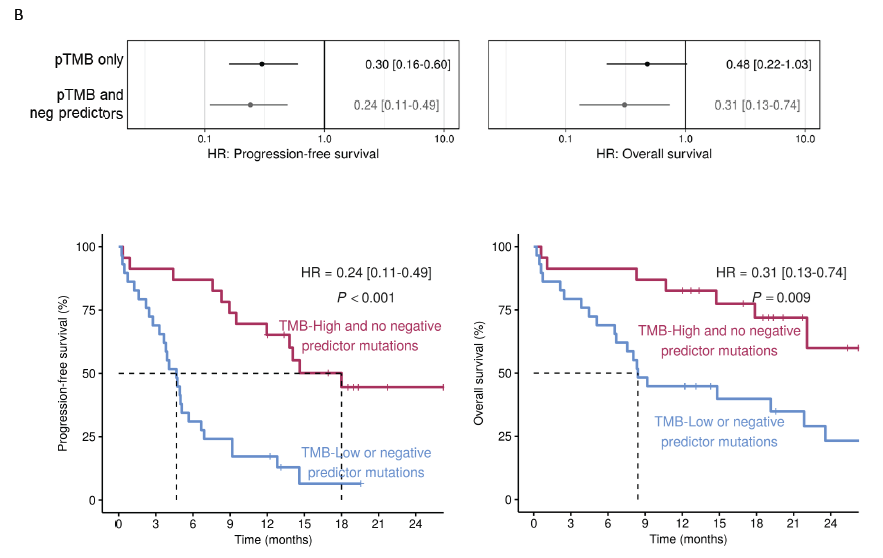 本研究是目前含帕博利珠单抗一线治疗的mNSCLC研究中,评估pTMB与疗效相关性的最大的前瞻性研究。ORR、中位PFS和中位OS与既往研究相似。NGS检测pTMB并将其作为连续变量进行分析,结果显示,治疗9周(P=0.037)和6个月(P=0.003)时出现反应的患者,其中位pTMB值较高。使用16 mut/Mb作为pTMB界值,pTMB >16 mut/Mb患者的PFS改善(HR=0.30),并且更有可能维持DCB (OR=8.9)。研究还证明,将导致功能失活性的STK11/KEAP1/PTEN基因突变和ERBB2 20号外显子插入激活性突变与pTMB结果相结合,可以提高预测免疫治疗反应的能力。与既往报道相似,pTMB与肿瘤PD-L1表达无相关性。综上所述,本研究结果至少表明pTMB与mNSCLC一线帕博利珠单抗治疗的反应相关。