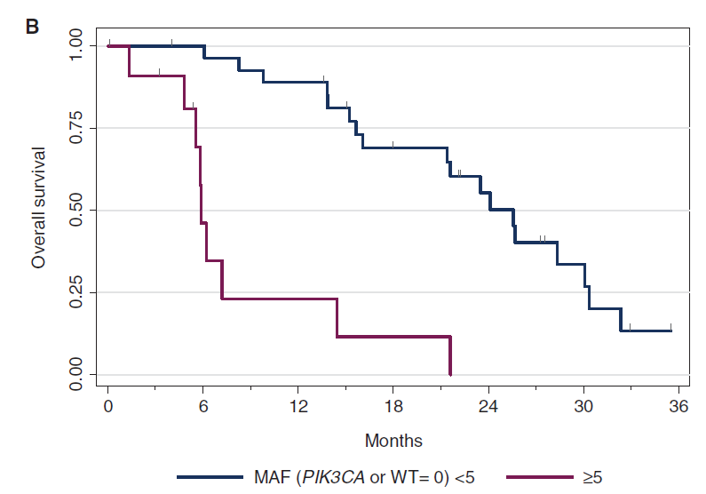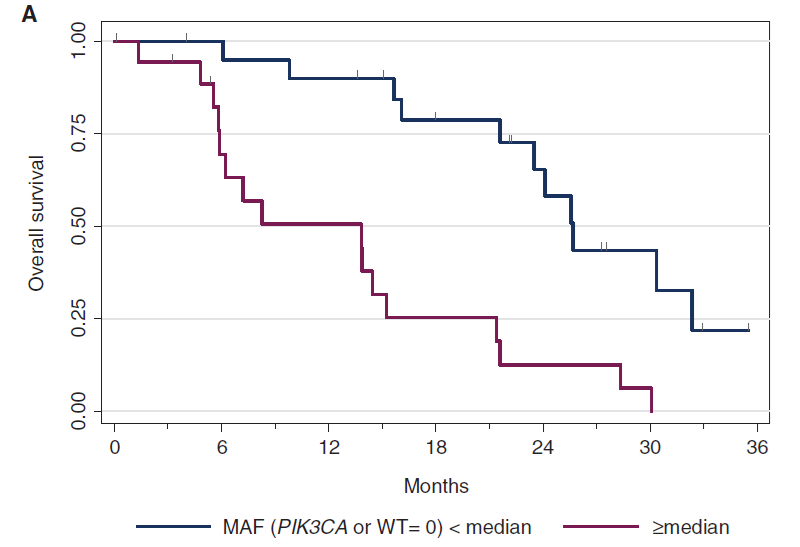 既往研究表明,PIK3CA基因突变的激素受体阳性/HER2阴性早期乳腺癌(eBCs)患者预后较好,但PIK3CA基因突变的转移性乳腺癌(mBC)患者的分子特征及预后情况并不明晰,而更好地了解PIK3CA突变mBC特征,对促进PI3K抑制剂的发展和应用非常重要。本研究表明,PIK3CA突变的HR+/HER2-的mBC和三阴性乳腺癌的中位总生存期(mOS)显著差于对应野生型患者(分别为 19.6个月vs 23.5个月,P=0.04;14个月 vs 24个月,P=0.03),而已有研究证实PI3K/AKT抑制剂提示使得这条通路突变的患者获益,提示了临床常规检测PIK3CA和其它共突变基因状态的重要性。
