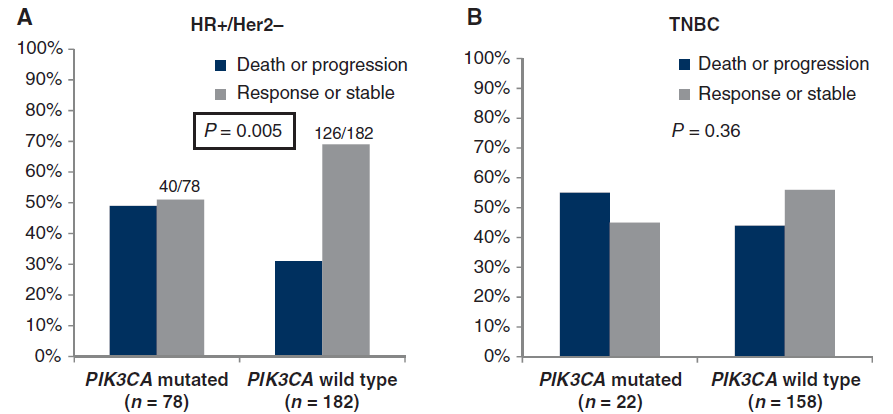 图1 (A)根据PIK3CA突变状态,HR+/HER2-mBC的化疗反应率;(B)根据PIK3CA突变状态,mTNBC的化疗反应率