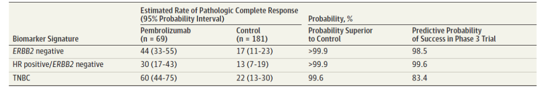 表1 III期试验中4个周期的帕博利珠单抗联合紫杉醇和蒽环类药物在3个ERBB2生物标记物治疗成功的最终预测概率
