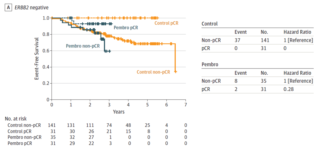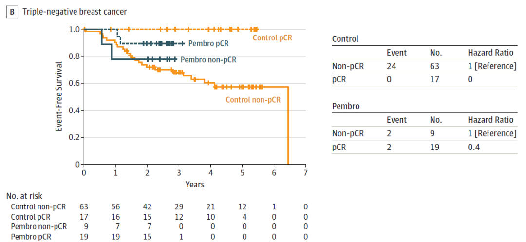 这项研究中对照组的pCR率随时间进展一直保持稳定,但低于其他新辅助治疗研究中的结果,这是因为本研究是一项非盲研究,治疗反应不佳患者随时可能会调整治疗方案,这些病例无论治疗反应如何均被视为非pCR,3例帕博利珠单抗研究组患者和11例对照组患者因此被归类为非pCR。