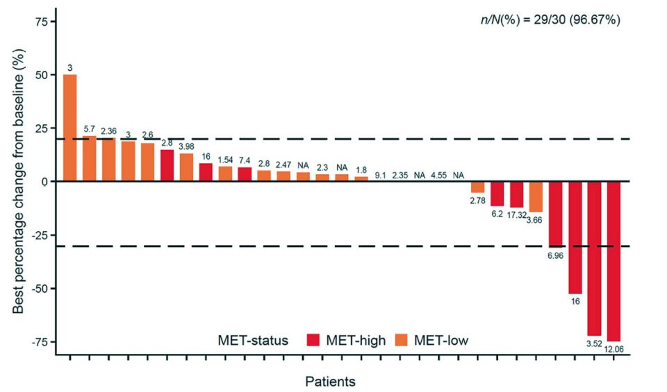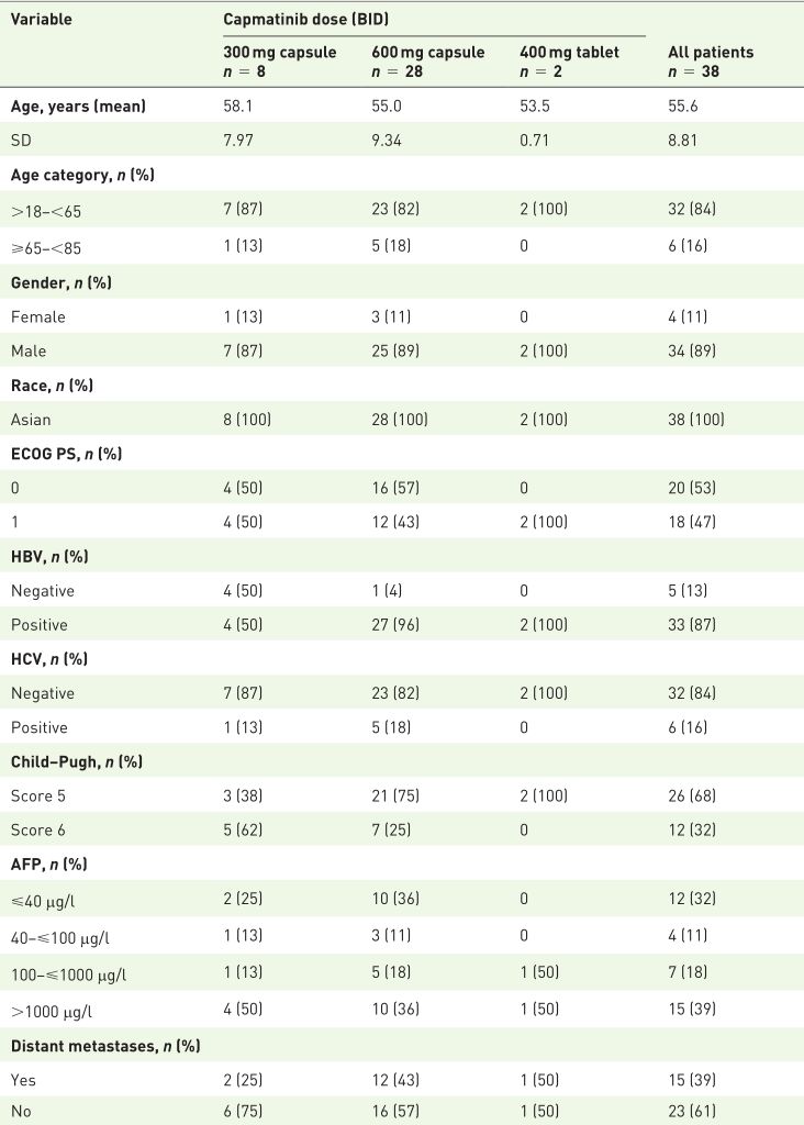 这是一项II期、开放式、单臂研究,每日两次口服 Capmatinib,使用Bayesian Logistic Regression Model(BLRM),以明确过量控制标准、安全性、药代动力学和扩展研究的推荐剂量(RDE)。研究纳入的患者均为未经化疗或分子靶向治疗、或4周内未经过局部治疗的HCC。MET高度异常(MET-高)定义为MET IHC⩾50%肿瘤细胞为3+,或是⩾50%肿瘤细胞为2+且FISH检测MET基因拷贝数(GCN)⩾5 或是如果无IHC结果,则FISH检测MET GCN ⩾5。