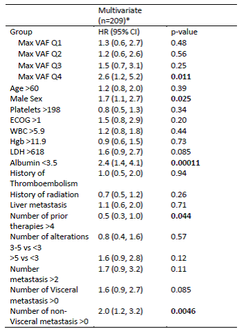 298例患者中共有240例(80.5%)检测到cfDNA突变。中位随访时间8.4个月,这部分患者的中位OS为11.5个月,Kaplan Meier曲线显示,298例患者中有116例(38%)死亡,3个月、6个月和12个月的生存率分别为83%、67%和49%。MaxVAF范围在0.1%~77.3%之间,按四分位数分类,Q1最低,Q4最高,不同肿瘤类型中MaxVAF差异显著,中位MaxVAF 以乳腺癌最高,阑尾癌最低(图1),Q1中MaxVAF为0.3%,Q2中MaxVAF为1.3%,Q3中MaxVAF为8.6%,无突变及Q1患者的1年OS率分别为63%、62%,Q4患者的1年OS率仅为20%(图2)。cfDNA突变和非同义突变(NSM)数量在不同类型肿瘤类型间存在显著性差异,本研究共检测到752个NSM,阑尾癌最低,结直肠癌的NSM最高,>1个NSM与更差OS相关(HR=2.3,p<0.0001,图3)。突变数量也会影响预后,>2个基因突变的患者与更差OS相关(HR=2.7,p<0.0001,图3)。单因素分析显示,VAF水平越高,OS越差(Q3 VAF HR 2.3,p=0.0069:Q4 VAF HR=3.8,p<0.0001)。多因素分析中, VAF Q4、男性、白蛋白<3.5g/dL、非内脏转移部位>0和既往治疗线数>4是OS更差的独立预测因素(表1)。