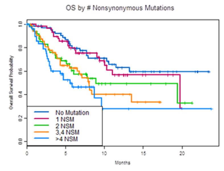 图3不同基因改变数量下的OS。上图. ≤2个和>2个cfDNA改变患者的OS;下图. 不同NSM数量下的OS