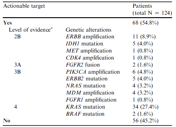 一直认为BTC很适合分子分类,包括FGFR和IDH抑制剂在内的各种靶向药物正在研究中,因此NGS分析可以提供与个体基因改变匹配的精准治疗。根据OncoKB分类,本研究中54.8%患者至少携带一种可作为靶点的的基因改变(表1),本研究中有8例(7.1%)患者接受了IDH1、FGFR或RAF1抑制剂治疗。几项FGFR改变患者的II期研究中,全FGFR抑制剂(Erdafitinib、Infigrinib或INCB054828)的客观缓解率为24%~46%,疾病控制率为76%~85%。FGFR融合患者较FGFR突变患者更可能受益于FGFR靶向治疗。最近一项评价IDH1抑制剂(AG-120)的研究报告,4/72(6%)携带IDH1突变的患者部分缓解和56%达到稳定疾病,证明AG-120有效性和安全性的III期研究在正在进行,其他IDH1和/或IDH2抑制剂正在研发。ERBB2扩增(8.9%)也是有前景的靶点,有报道HER2阳性BTC的抗HER2治疗的潜在活性,几项前瞻性研究正在进行中。