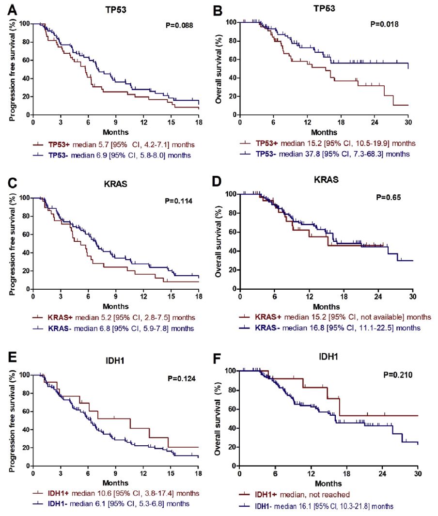 一些基因改变与生存结果相关,TP53突变与更差的生存结果明显相关,与既往报道一致。KRAS突变和IDH1突变患者倾向于分别具有更差和更好的PFS。虽然既往研究表明了其他遗传学改变对预后的影响,如BAP1突变,FGF途径改变、ARID1A突变和CDKN2A/B缺失,但本研究中未检测到这种关联,差异可能与患者基线异质性相关。