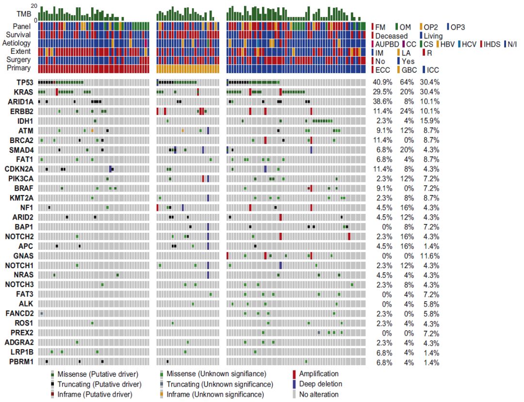 研究者针对124例BTC患者(GBC25例,ICC55例,ECC44例)进行了二代测序测序,对112例无法局部切除或转移性疾病接受姑息性化疗的患者进行了生存分析。