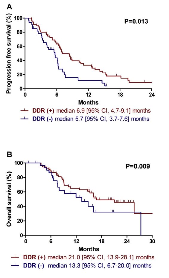 图3 根据DDR基因突变状态PFS(A)和OS(B)与含铂化疗的关系