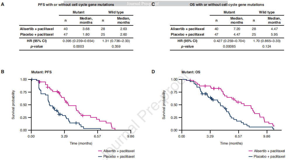 纳入178例患者,每组89例。Alisertib联合紫杉醇组与安慰剂联合紫杉醇组的中位PFS分别为3.32和2.17个月(意向性治疗人群[ITT]风险比[HR]:0.77;95%CI:0.557~1.067;p=0.113;修改后HR:0.71;95%CI:0.509~0.985;p=0.038);总计有140例患者携带(CDK6/RBL1/RBL2/RB1)基因突变,其中试验组及对照组患者的PFS分别为3.68和1.80个月(HR:0.395;95%CI:0.239~0.654;p=0.0003)和总生存分别为7.20和4.47个月(HR:0.427;95%CI:0.259~0.704;p=0.00085);c-Myc表达患者接受Alisertib联合紫杉醇治疗其PFS获益。二组中≥3级药物相关不良事件发生率分别为67%和22%,死亡患者分别为12例和11例,治疗相关死亡分别为4例和0例。