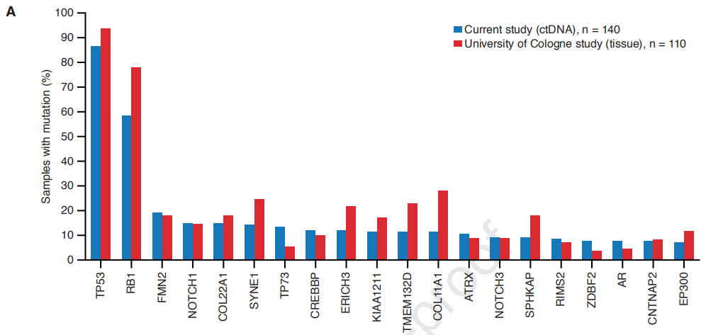 图1A,本研究及Cologne大学关于小细胞肺癌的常见基因突变图谱;图1B,细胞周期相关基因突变比率;图1C,细胞周期相关基因突变与PFS及OS之间的关系。