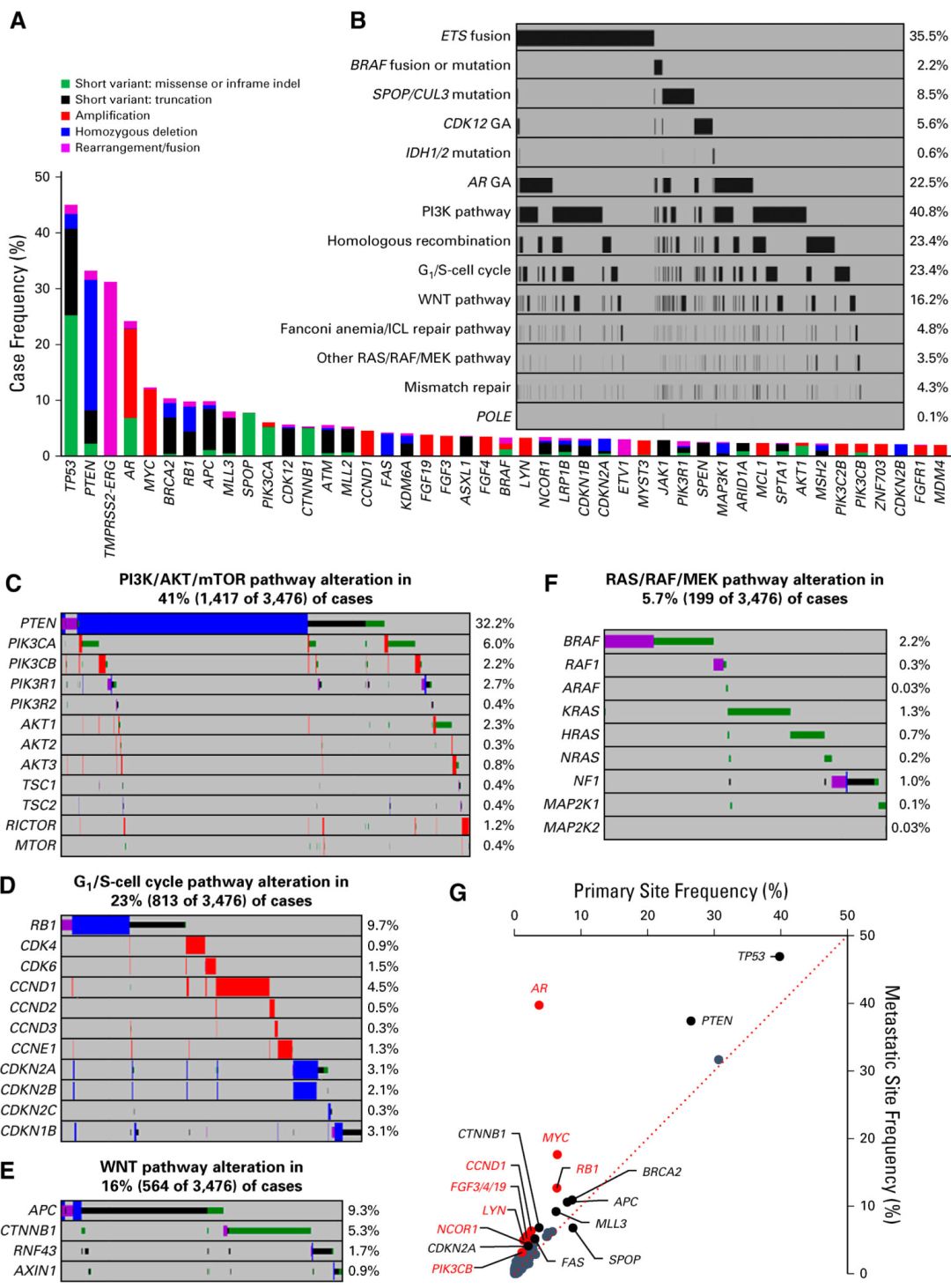 图1 前列腺癌原发灶与转移灶的基因组特征(A)3476例患者中的GAs频度;(B) 主要改变途径,包括ETS融合、BRAF重排/突变、SPOP/CUL3突变、CDK12 GAs、IDH1/2 突变、AR GAs、PI3K途径GAs、HR GAs, G1/S细胞周期GAs、WNT 途径GAs、范可尼贫血/链间交联修复(FA/ICL)途径GAs、RAS/RAF/MEK 途径GAs、MMR GAs和POLE 突变;(C) PI3K/AKT/ mTOR途径;(D) G1/S细胞周期途径;(E) WNT 途径;(F) RAS/RAF/MEK 途径;(G) 原发与转移前列腺癌基因改变的比较