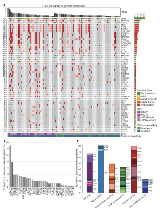 图1 突变分析。(a) NAC后进展期卵巢癌的突变谱与拷贝数突变;(b) 15个具有再现性的HRR基因突变以及22个可作为靶点的拷贝数变异;(c) 6个可作为靶点的功能性通路的突变