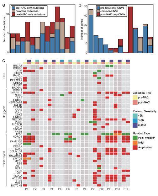 既往研究表明,除BRCA外,初治HGSOC突变的基因数目众多,化疗后残余的肿瘤基因突变情况尚不清晰。而且既往外显子研究分析显示,除TP53以外,HGSOC多由拷贝数变化所致,而非点突变所致。
