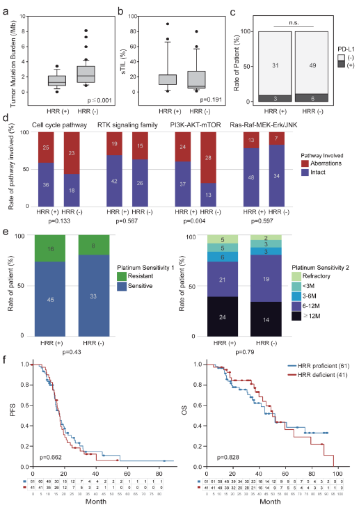 图2 HRR缺陷(-)与HRR无缺陷 (+) 肿瘤的比较。(a) TMB ;(b) TILs(%);(c) PD-L1 表达;(d) 功能性通路;(e)铂敏感;(f)生存