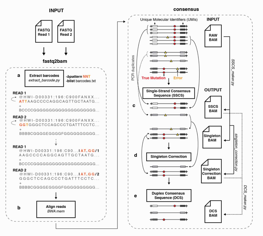 (e)最后是将两者的结果合并生产最终结果。此外这一步中还包含针对正反互补链的联合矫正结果duplex consensus sequences(DCSs)。
