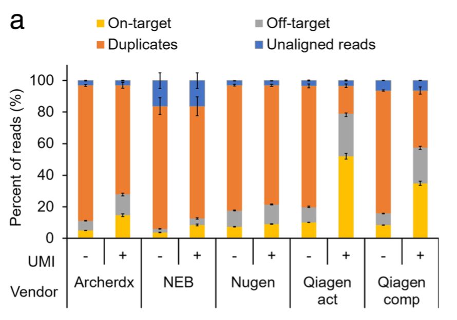 文献中选取了市场上的5种商业试剂盒进行比较,结果显示,在添加UMI后on-target rate 增加了1.7–41.9%,平均测序深度是原来的1.19–5.13倍,这说明针对不同的商业试剂盒差异还是蛮大的。