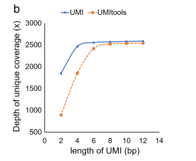 显而易见UMI的长度会影响到文库的多样性,针对同一文库作者比较了2-12bp之间的文库复杂度评估发现UMI的长度当达到6bp时,文库多样性趋于稳定,因此最小的UMI的长度设定在6-8bp之间。
