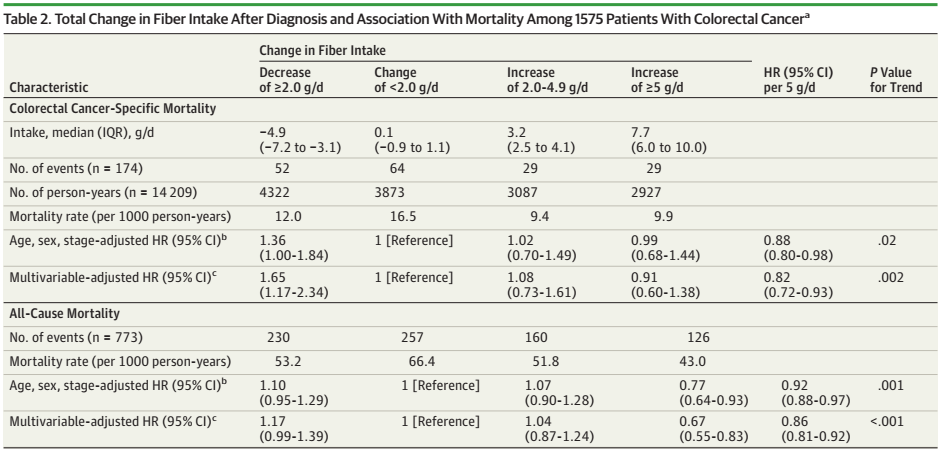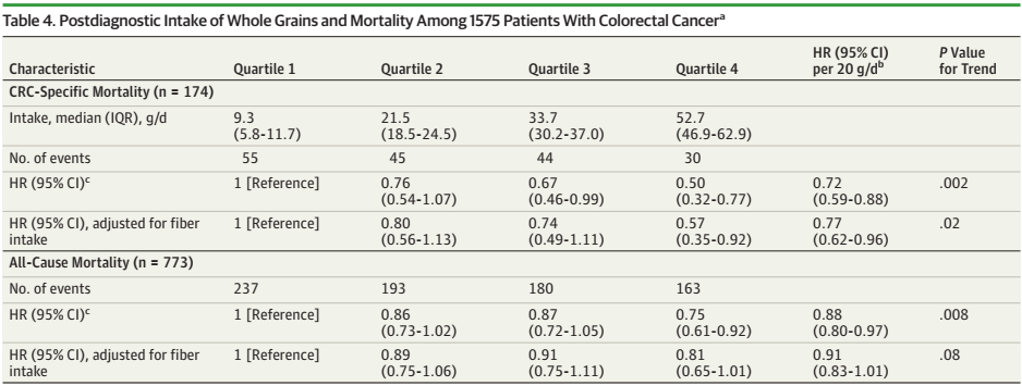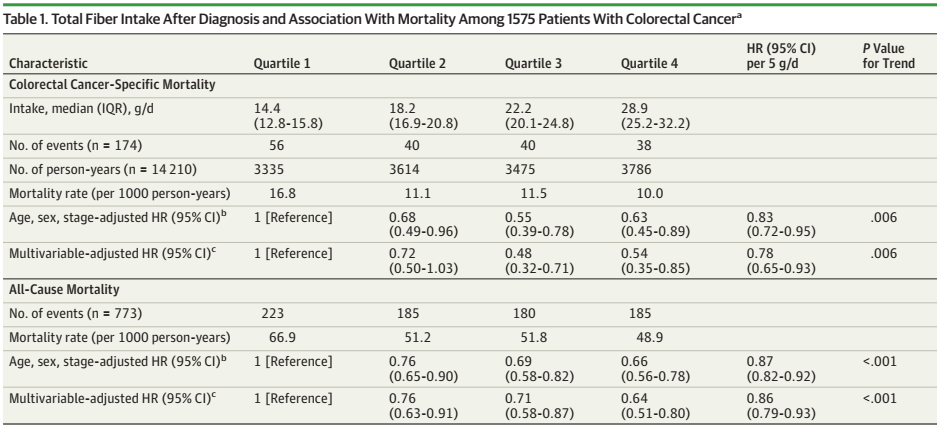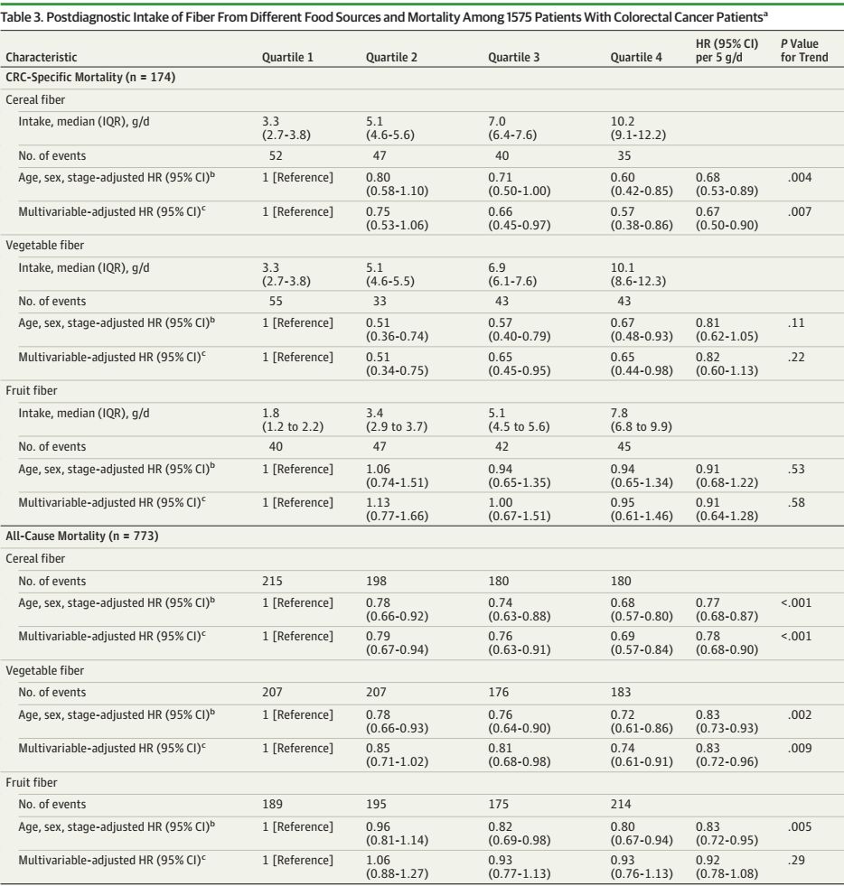 该研究主要基于两个较大的前瞻性队列,护士健康研究(Nurses’Health Study , NHS)及健康专业人员随访研究(Health Professionals Follow-up Study , HPFS)的数据。共纳入1575例I〜III期结直肠癌(CRC)患者作为研究对象, 在 1575 名参与者中,963 名是女性; 平均年龄为 68.6岁。在CRC诊断后6个月至4年之间采用食物频率问卷评估总纤维及不同纤维来源和全谷物的摄入,通过应用Cox比例风险回归模型,计算调整其他潜在的癌症存活预测因素后,CRC死亡率和总体死亡率的风险比(HR)和95%置信区间(CI)。