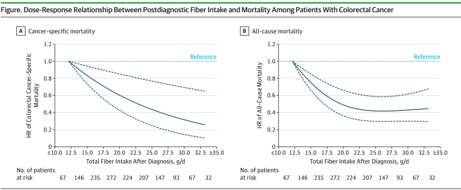 近期,来自麻省总医院和哈佛医学院的研究团队以题为“Fiber Intake and Survival After Colorectal Cancer Diagnosis”的研究论文发表在国际顶级期刊《JAMA Oncology》上。研究团队通过系统地分析发现:较高的纤维摄入量,特别是来自谷类的纤维摄入量,与较低的CRC死亡率和总体死亡率相关; 诊断之后增加纤维摄入量的患者存活率更高。另外,较高的全谷物摄入量也与较低的CRC死亡率有关。