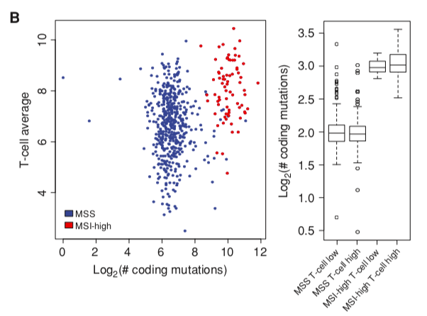 图3: MSS型和MSI-H型结直肠癌中T细胞平均值、编码突变的数量