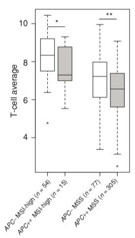 图7: MSS型和MSI-H型结直肠癌中有无APC等位基因缺失T细胞平均值