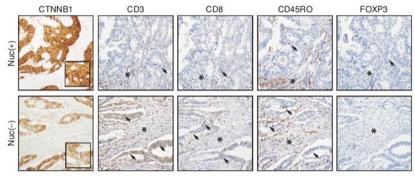 进一步研究了核CTNNB1和CD3 +细胞,CD8 +细胞(细胞毒性T细胞),CD45RO +细胞(抗原经历的记忆T细胞)和FOXP3 +细胞(调节T细胞,抑制细胞毒性T细胞)之间的相关性。观察到核CTNNB1表达与CD8 +细胞(P = 0.002),CD45RO +细胞(P = 0.008)和CD3 +细胞(P = 0.054)之间存在显着的负相关,而与FOXP3 +细胞无关(P> 0.1)(图5);组织染色显示结直肠癌核CTNNB1蛋白高表达组,TILs是低水平,核CTNNB1蛋白不表达组,显示更高水平的TILs(图6)。