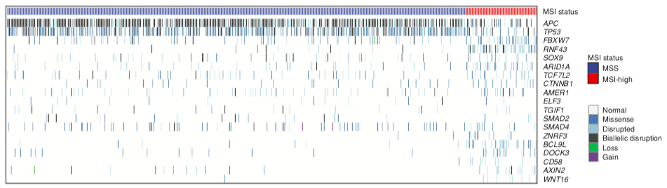 图2: MSS型和MSI-H型结直肠癌中参与WNT信号通路的显著突变基因