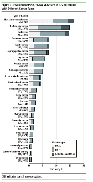 2019年8月15日,JAMA上发表的一篇研究中综合分析了cBioPortal数据库中47721例泛癌种患者的POLE/POLD1突变及接受免疫治疗疗效的情况。