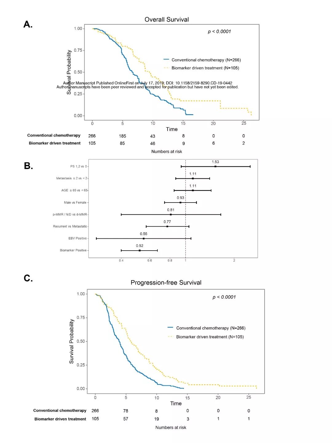 本研究研究提示,通过肿瘤基因组分析匹配相应的治疗可以改善进展期GC的2L治疗结果(图5);雨伞类研究可有效识别生物标志物-治疗的匹配。