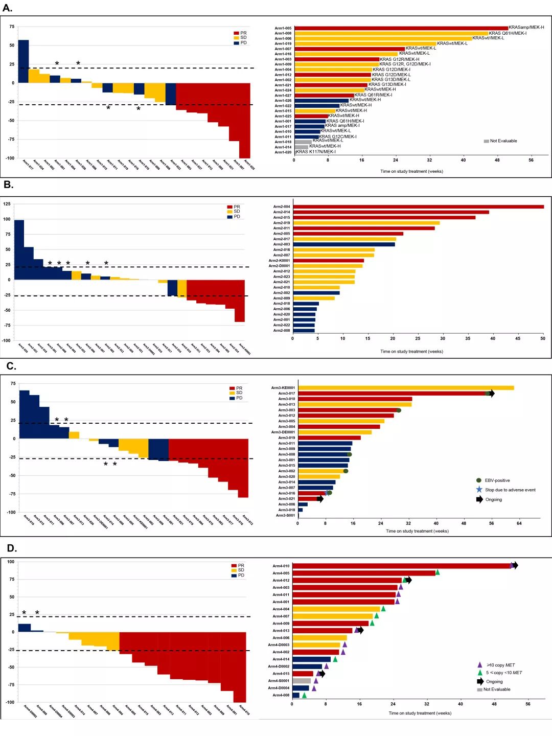 图3. 药物有效性数据。A)组1: Selumetinib(MEKi)/多西他赛-RAS畸变;B) 组2: Adovasertib (WEE1i)/紫杉醇-TP53突变;C) 组3: Capivasertib(AKTi)紫杉醇-PIK3CA突变;D)组4: Savolitinib (METi)-MET扩增