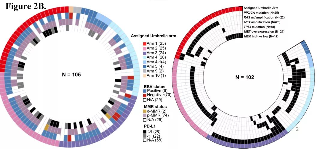 图2. 105例患者根据分子标志物分入治疗组,右侧为肿瘤特征(MMR状态、EBV、PD-L1表达)和共存分子改变