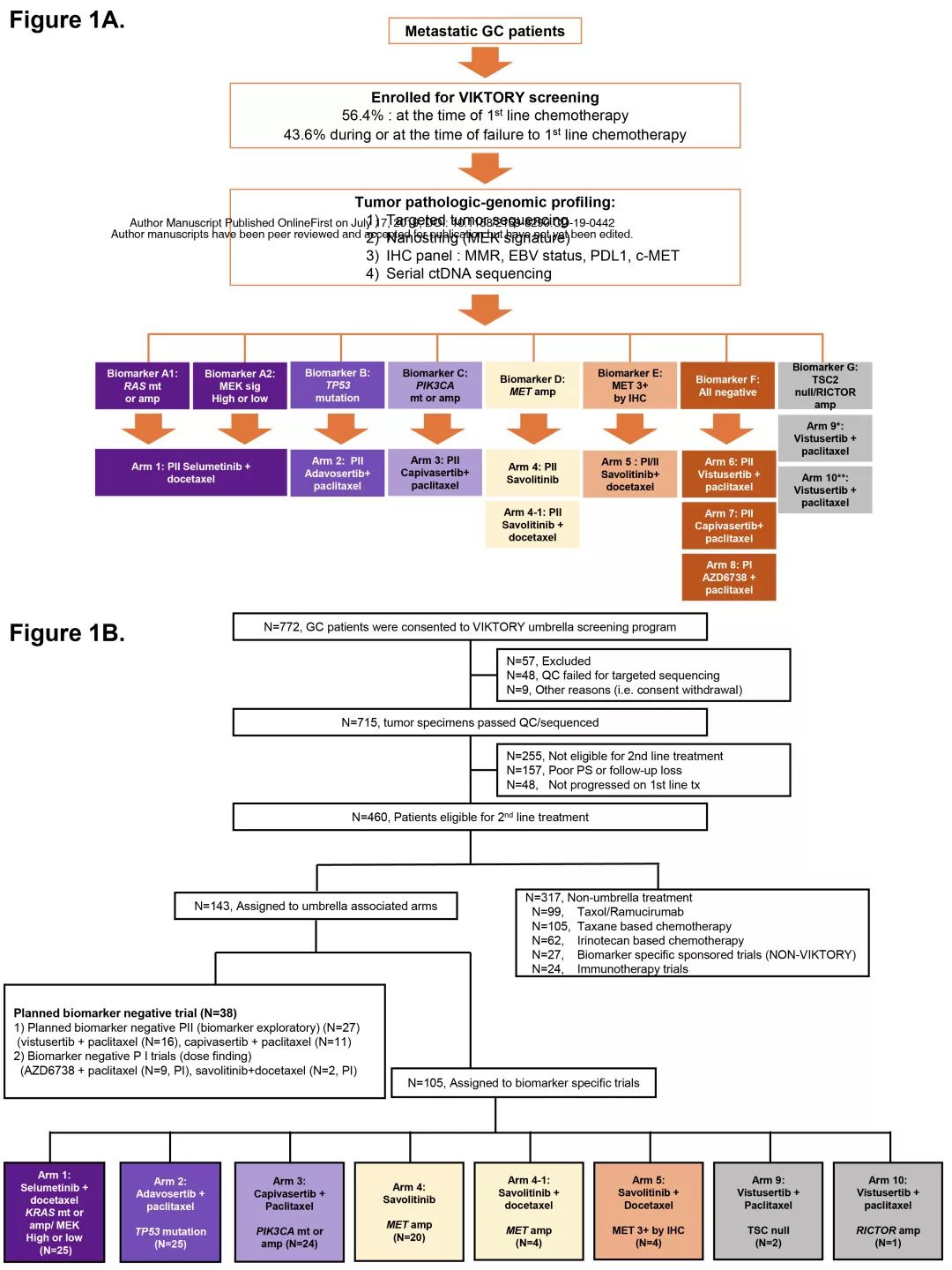 本研究旨在依据NGS测序结果对转移性GC进行分类,着重评估了8个生物标志物(RAS突变、TP53突变、PIK3CA突变/扩增、MET扩增、MET蛋白过表达、全阴性、TSC2缺失、RICTOR扩增),候选标志物包括TP53、PIK3CA、MET、EGFR、FGFR2、RAS和DDR通路。根据分子突变情况,患者的二线治疗分入了10个对应治疗组,治疗药物包括Capivasertib(AKT抑制剂)Savolitinib(MET抑制剂)、Selumetinib(MEK抑制剂)、Adavosertib(WEE1抑制剂)和Vistusertib(TORC抑制剂)等(图1)。