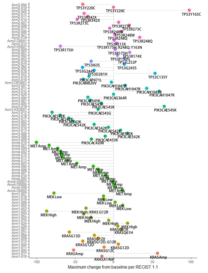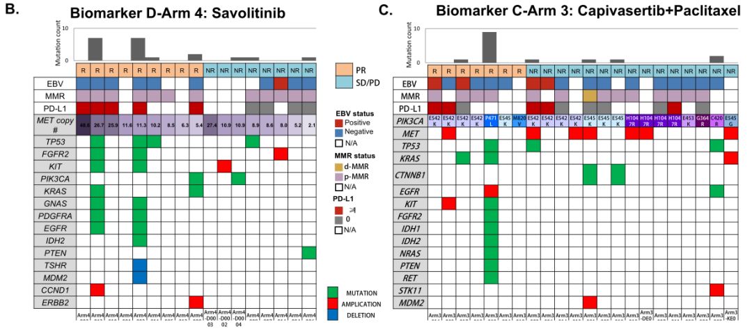 图4. 组1-4患者的分子突变和药物有效性。A) 治疗后肿瘤相较基线的最大变化;B) Savolitinib单药组患者的分子改变(组4);C)Capivasertib/紫杉醇组患者的分子改变 (组3)