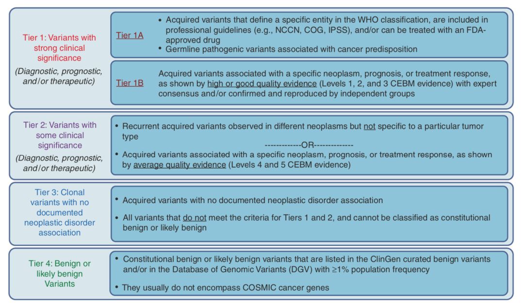 Li M M, Datto M, Duncavage E J, et al. Standards and guidelines for the interpretation and reporting of sequence variants in cancer: a joint consensus recommendation of the Association for Molecular Pathology, American Society of Clinical Oncology, and College of American Pathologists[J]. The Journal of molecular diagnostics, 2017, 19(1): 4-23.