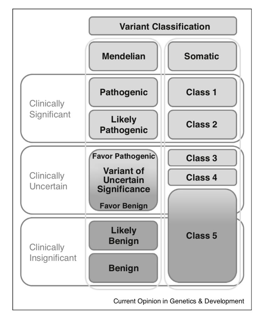 早在2015年,美国医学遗传学和基因组学(ACMG)以及分子病理学协会(AMP)曾联合出版了变异位点解读指南,基于28个判断标准(criteria)将变异位点分为了Pathogenic、Likely pathogenic、Uncertain significance、Likely benign和Benign五个级别。同样,在2017年,AMP、ASCO和CAP也联合制定了体细胞突变变异位点解读指南,基于变异位点的临床意义将其分为Tier I、Tier II、Tier III、Tier IV四个级别。时隔两年,由中国遗传学会遗传咨询分会领衔的专家团队共同编译了《ACMG遗传变异分类标准与指南》中文版(以下简称“中文版”),并获得美国ACMG的官方授权。