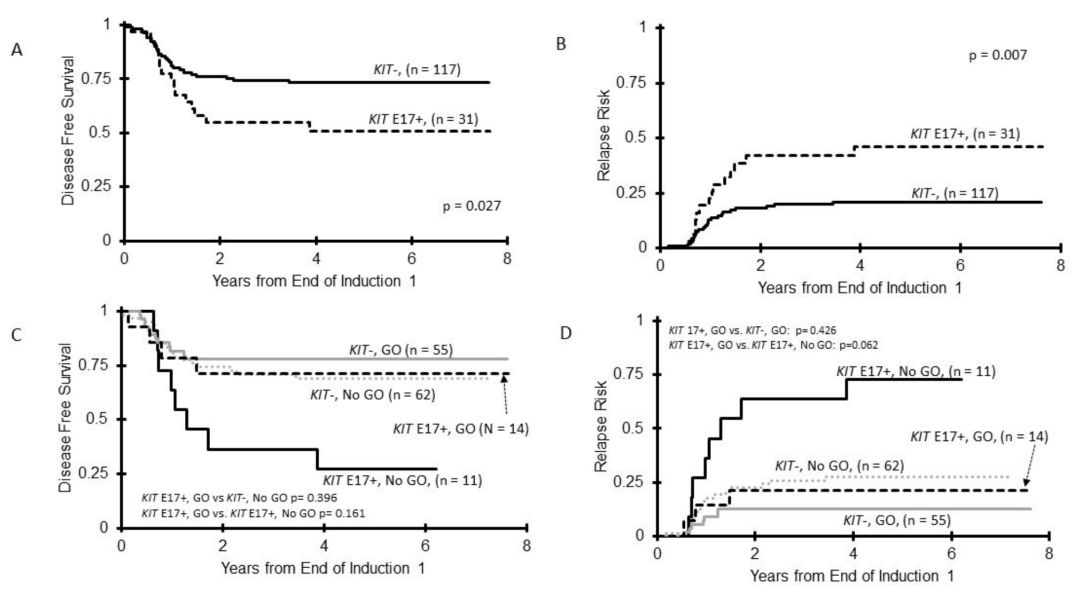 图4 E17突变与CBF-AML临床结局的关系。(A)KIT+与KIT野生型 患者的DFS比较(B)KIT+与KIT野生型患者的RR比较;(C)E17+与KIT野生型患者采用含有GO和不含GO治疗时的的DFS;(D)E17+ 与KIT野生型患者采用含有GO和不含GO治疗时的RR