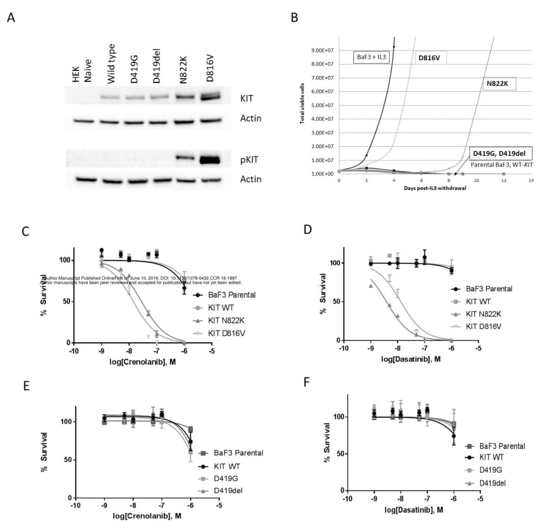 图2 KIT的8号外显子和17号外显子突变的体外功能评价。(A)外显子8(D419G,D419del)和17(D816V,N822K)突变转染HEK293细胞后,KIT磷酸化;(B)Ba/F3细胞系中IL3撤除实验证实E17 D816V和N822K突变的转化潜能;(C)crenolanib对D816V和N822K转染Ba/F3细胞的细胞毒作用;(D)达沙替尼对D816V和N822K转染Ba/F3细胞的细胞毒作用;(E)crenolanib对D419del和D419G转染Ba/F3细胞的细胞毒作用;(F)达沙替尼对D419del和D419G转染Ba/F3细胞的细胞毒作用